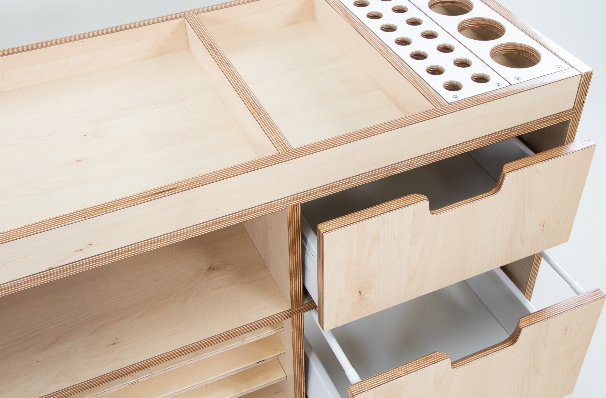 It is designed with a top tray, two drawers, removable utensil holders and plywood shelves for storage of A4 & A3 paper.